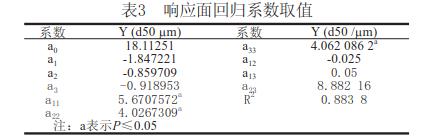 利用響應(yīng)面分析法[1]化枸杞子渣超微粉碎工藝參數(shù)。在單因素預(yù)試驗基礎(chǔ)上,用SAS軟件系統(tǒng)進(jìn)行響應(yīng)面分析,設(shè)計一個三因素五水平的回歸方程來擬合因素和指標(biāo)(響應(yīng)值)之間的函數(shù)關(guān)系。選擇球料比(X1)、枸杞子渣漿液濃度(X2)和攪拌器轉(zhuǎn)速(X3)作為因素,以粉碎后的顆粒粒度d50作為響應(yīng)值對球磨機濕法超微粉碎工藝進(jìn)行化。